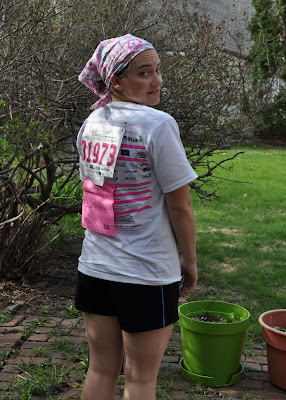 The Prairie Princess is now on her way back to southern Wisconsin. While she was here, this morning, she participated in the Susan G. Komen Race for the Cure, a breast cancer benefit that runs on Mother's Day each year at the Mall of America. She ran the 5K before 9 a.m. and came home in her outfit. She bought the t-shirt as part of the entry fee, and the number on her back helps indicate the size of the turnout in the Twin Cities. She was near the last to register, so 32,000 may be a reasonable guess for the number of runners.